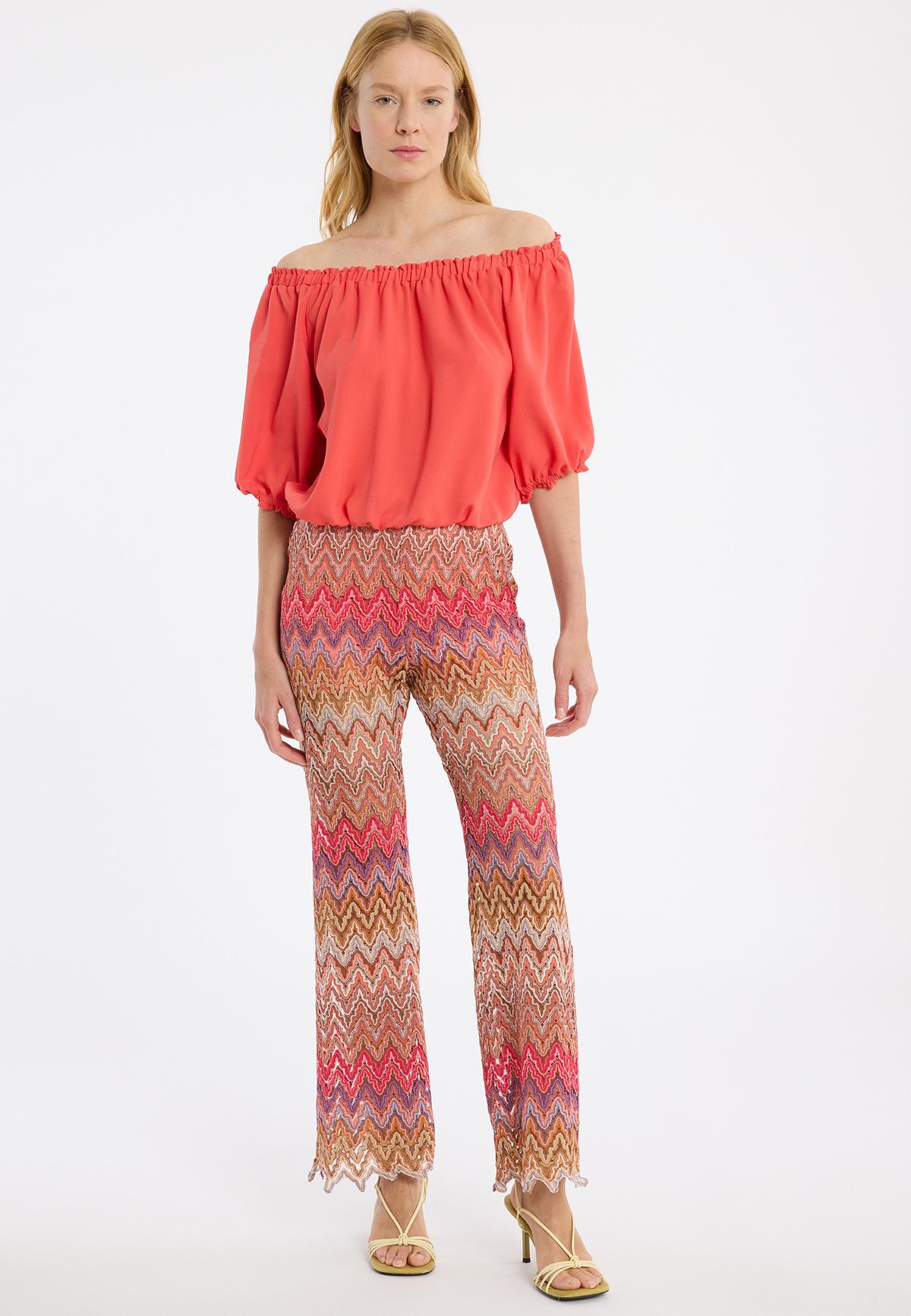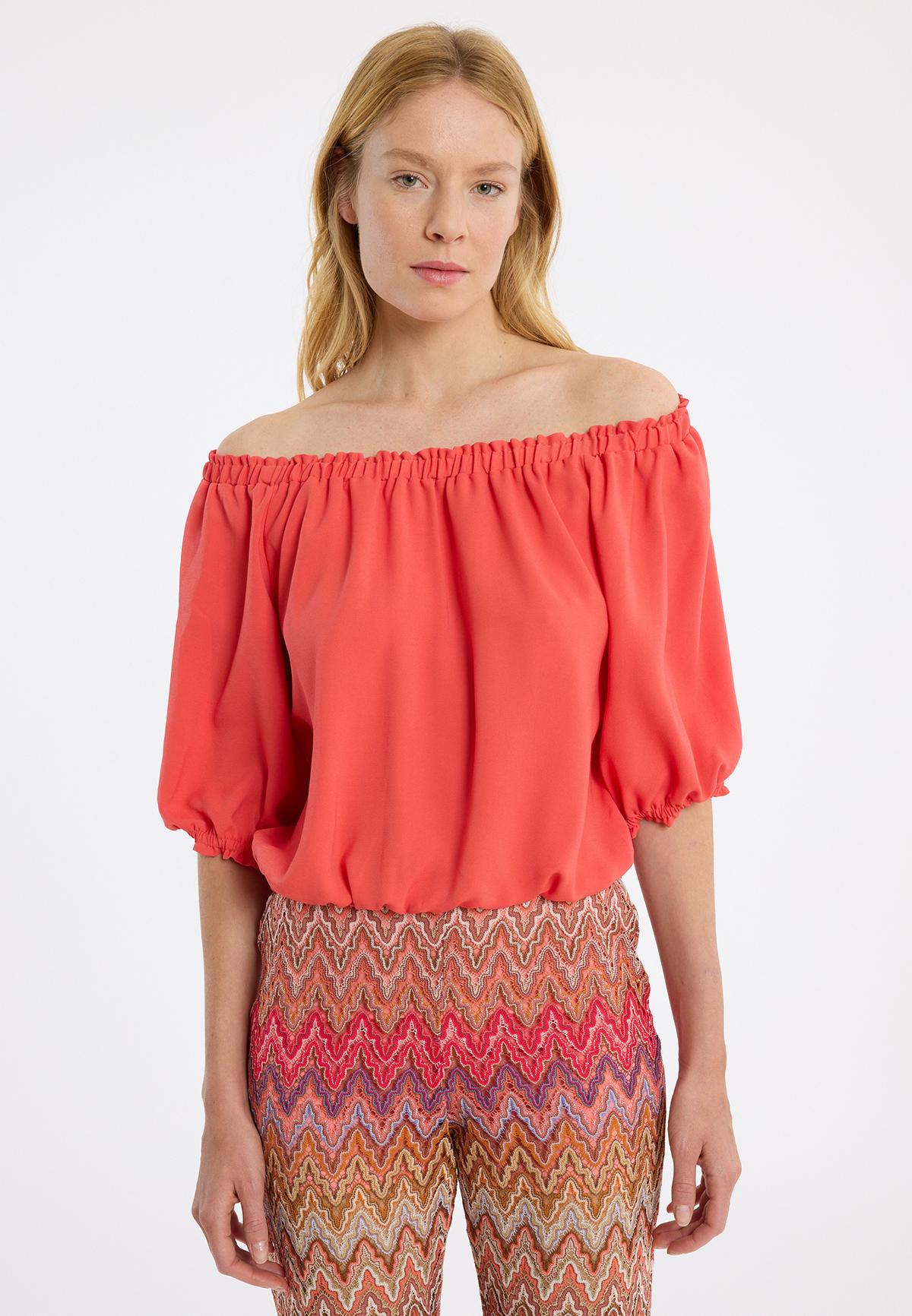 The Zapuna off-the-shoulder top in bright coral red is a real eye-catcher. With its wide ¾ puff sleeves and feminine off-the-shoulder design, it skilfully shows off your shoulders. The lightweight viscose fabric ensures a breezy and comfortable fit. Whether paired with the matching Zapasa cargo trousers for a trendy city look or with denim shorts for a relaxed day at the lake, the Carmen top is extremely versatile.