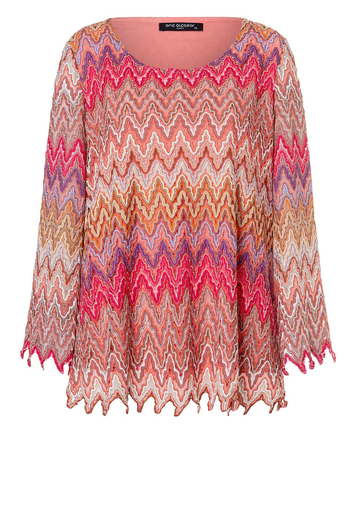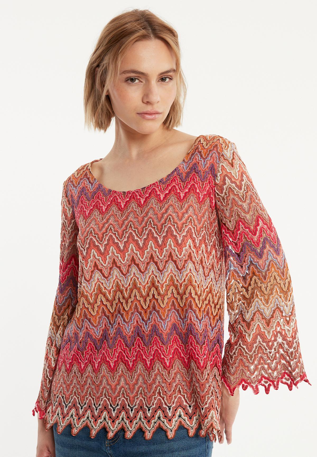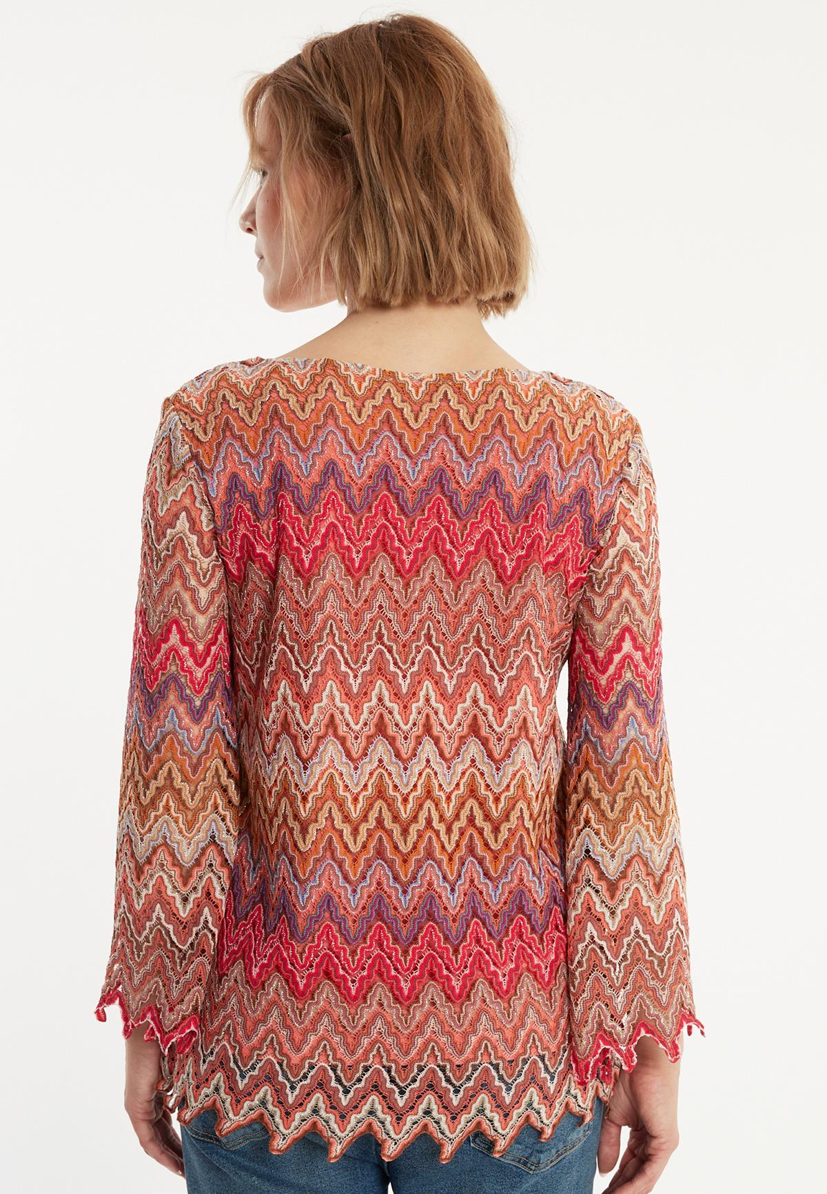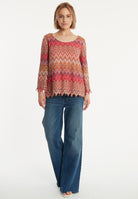 The Zecosa long-sleeved top in summer knit in bold red, brown and purple tones offers a combination of comfort and style. The casual cut and wide round neckline ensure a relaxed fit, while the ajour zigzag pattern gives the top a dynamic touch. Perfect as a two-piece set with our matching Zaybea trousers for an elegant look or casually combined with jeans for everyday wear. Wear with light sneakers or boots and a trendy shoulder bag.