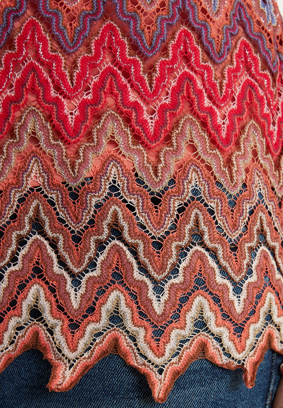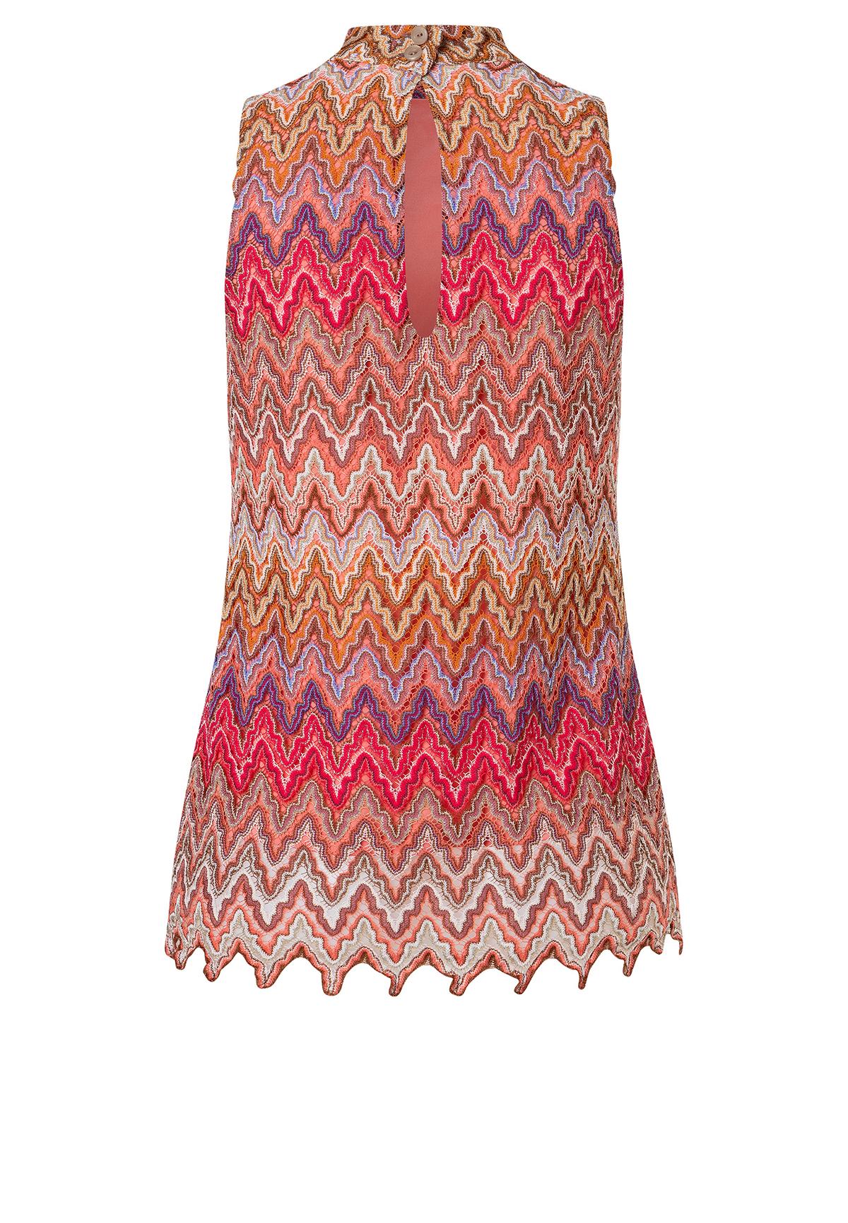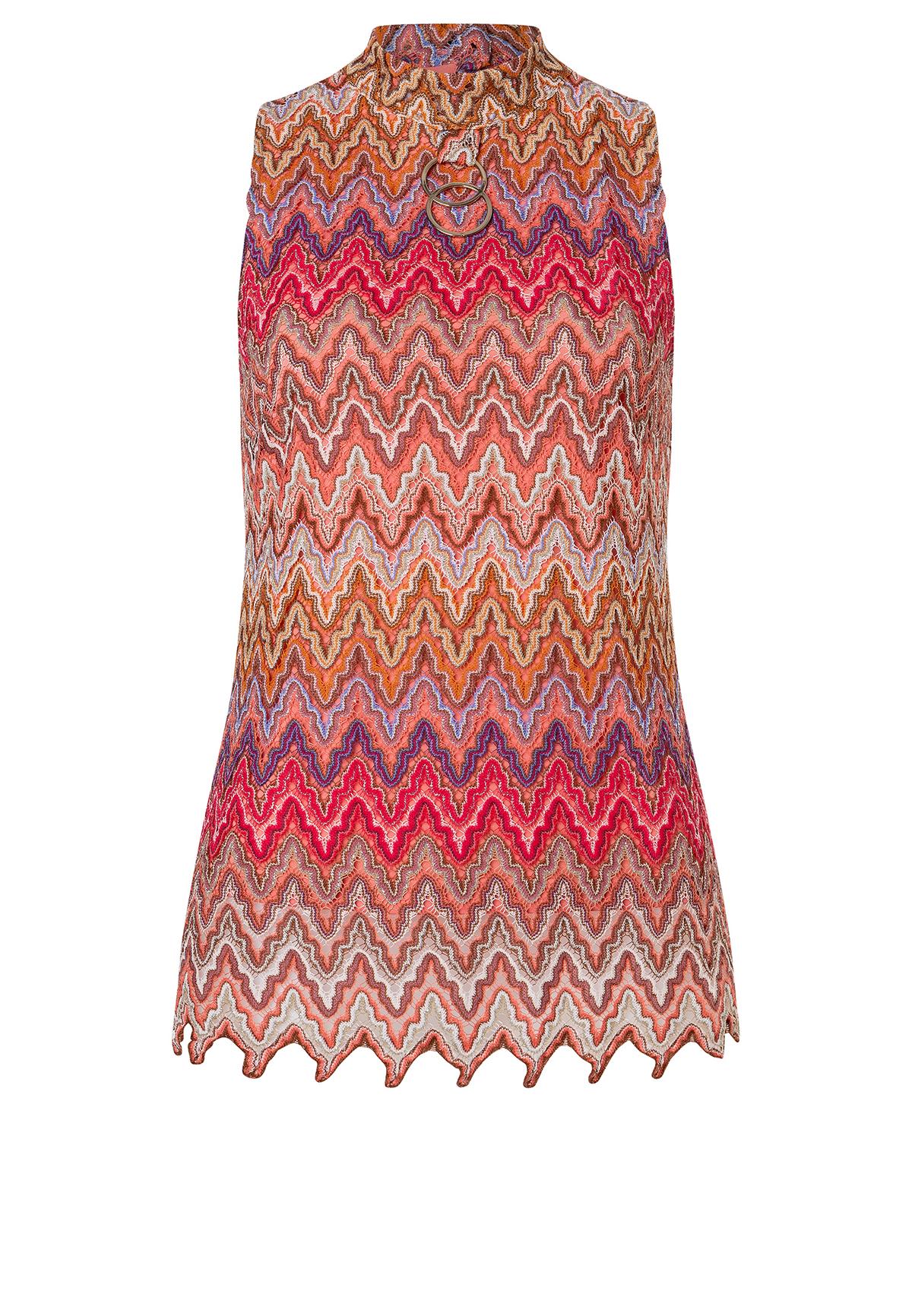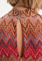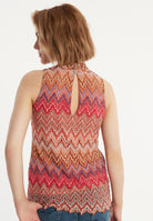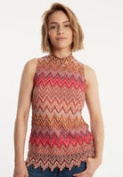 The sleeveless Zecara knit top in shades of red, brown and purple is a versatile highlight for warm days. With its off-the-shoulder, figure-hugging cut and small stand-up collar, it offers elegance and comfort at the same time. The summer knit with a zigzag pattern gives the top a lively touch. Combine it as an elegant two-piece outfit with the matching Zayasa trousers or wear it casually with jeans for a picnic in the park.