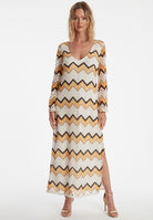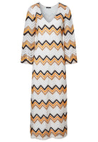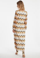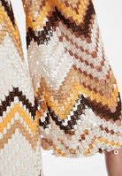 The Wiwi kaftan dress in zigzag knit brings summery lightness to your look. The straight cut, semi-transparent trumpet sleeves and wide V-neckline create a feminine silhouette, while the side slit on the leg adds subtle elegance. Made from fine summer knit, the ajour dress with its zigzag pattern in white, sunny yellow and cappuccino offers airy comfort. Whether elegant with delicate strappy sandals and a clutch or relaxed with boho flats and a sun hat on holiday, our Wiwi kaftan dress adapts perfectly to your style and lets you shine on any occasion.