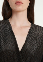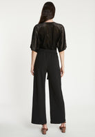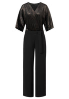 The black Tamara jumpsuit combines an elegant velvet wrap top with a tone-on-tone graphic pattern and wide-leg trousers. The short, casual sleeves and belt that accentuates the waist create a stylish silhouette. Two side pockets add a practical touch to the jumpsuit. Ideal for elegant evening events or formal occasions, it offers a sophisticated alternative to a dress. Pair it with high heels and an elegant clutch to complete the look. Perfect for women who appreciate modern elegance.