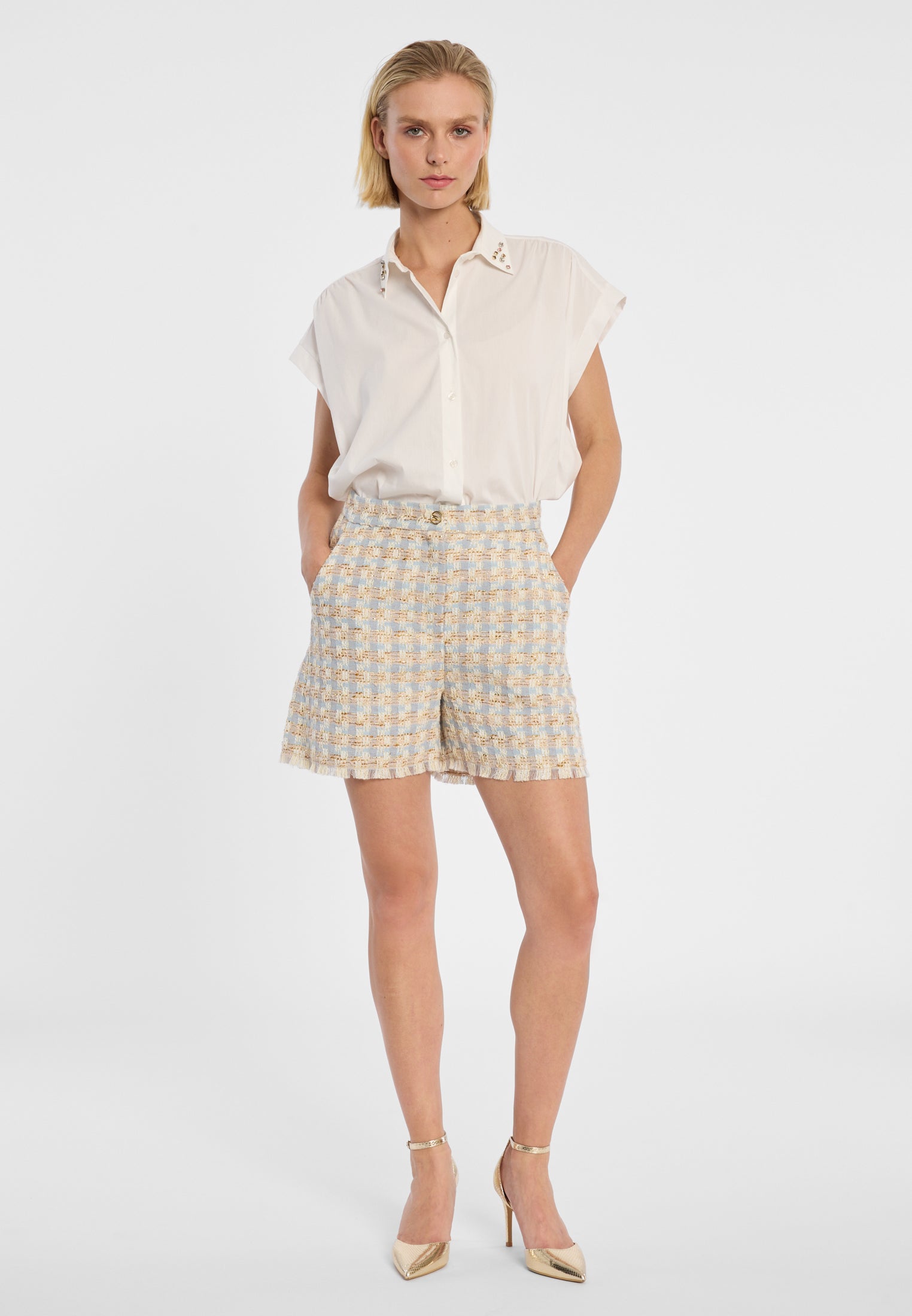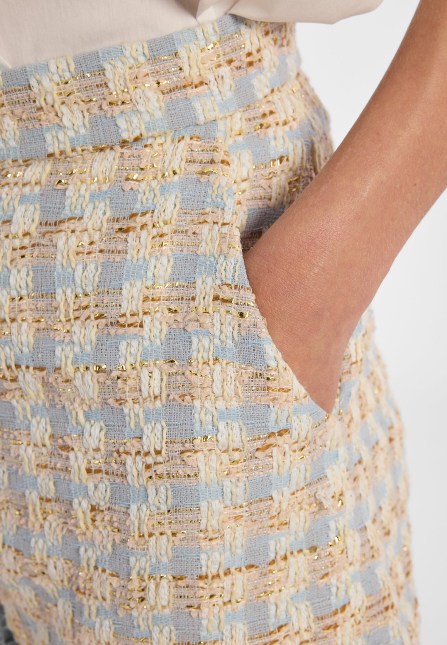 Zacht. Sterk. Helemaal jij. Een tweedelige tweed-set in zachte tinten die elegantie herdefinieert – modern, vrouwelijk en vol zelfverzekerde lichtheid.
